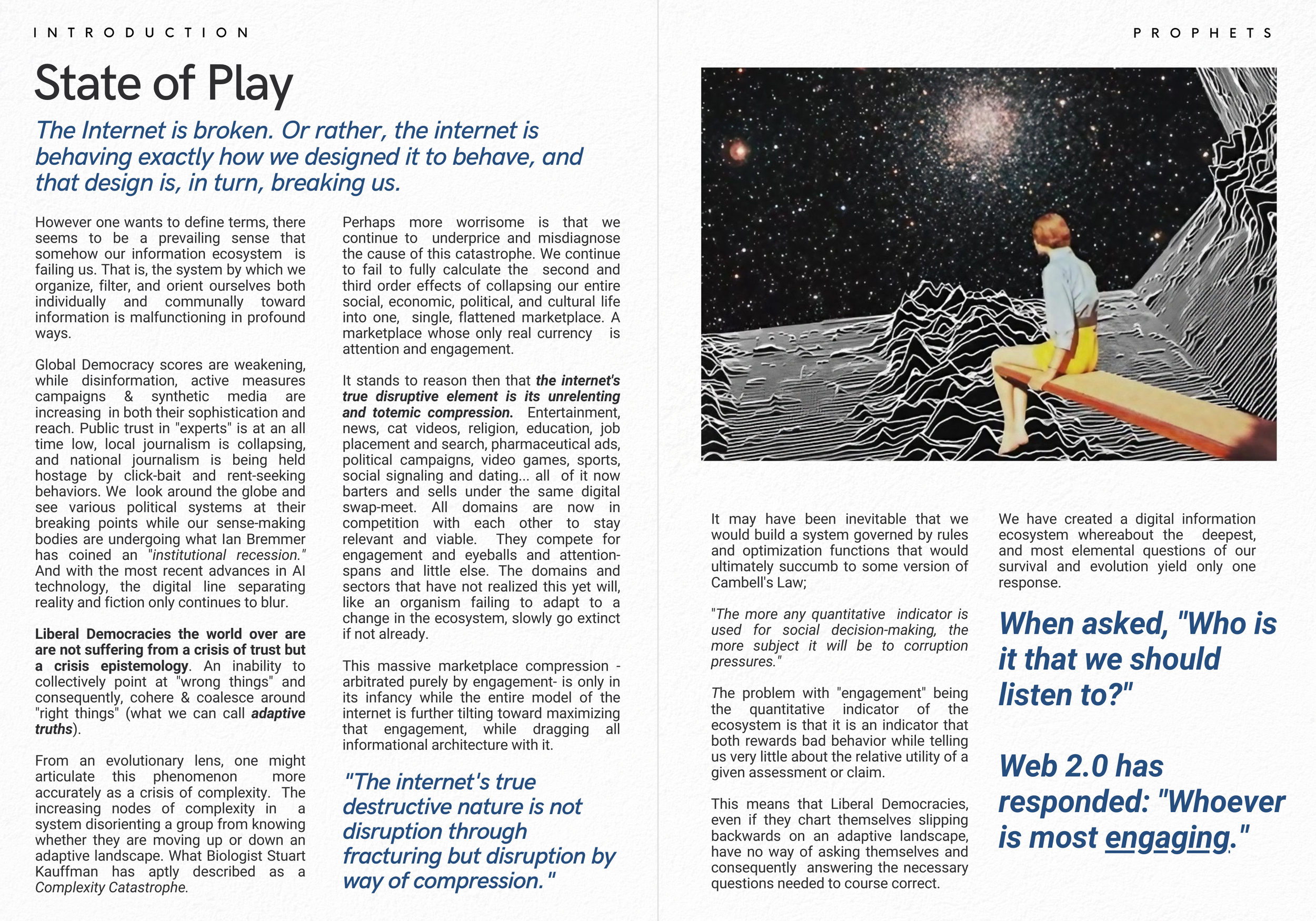 The following pages are about the first steps toward building an entirely new kind of information ecosystem. A different kind of internet.